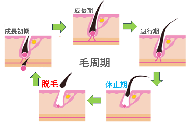 毛周期は 成長期(Anagen)・退行期(Catagen)・休止期(Telogen)・脱毛期(Exogen) の4段階に分類されます。